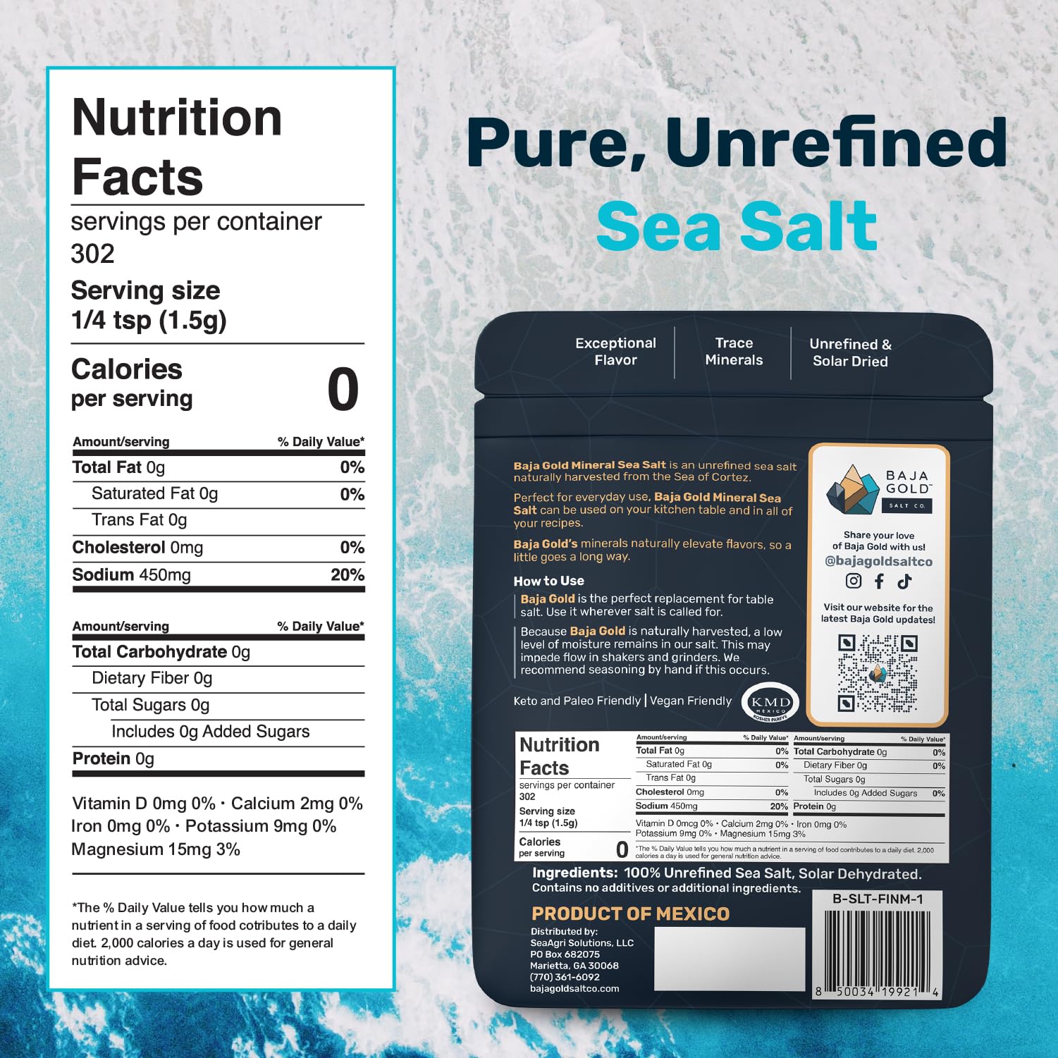 Experience the clean, bright flavor of naturally unrefined sea salt harvested from the warm coastal waters of Baja. Unlike standard table salt, which is almost pure sodium chloride stripped of minerals, Baja Gold retains its full spectrum of over 50 naturally occurring trace minerals. Those minerals help your body absorb the salt more smoothly, making it a better option for cooking, finishing dishes, and even adding to water for electrolyte support.