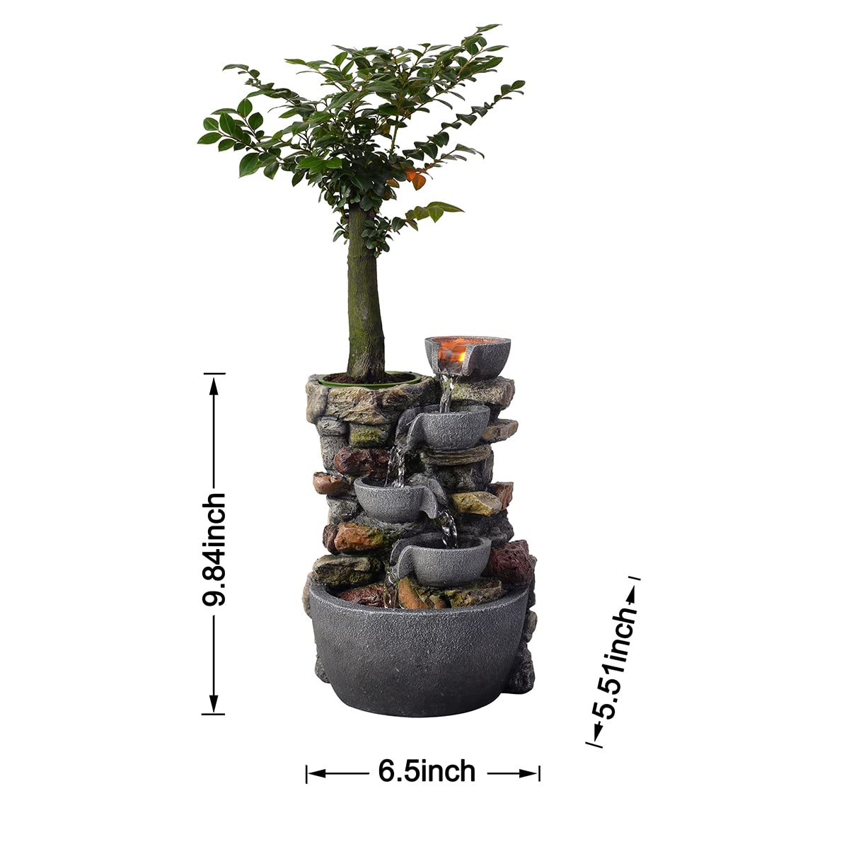 This tabletop fountain blends flowing water and living greenery into one peaceful display. Designed with four gently tiered bowls and a hand textured rockery finish it creates the soft sound of a small waterfall right on your desk or side table. The warm LED lighting casts a subtle glow over the water as it moves adding a quiet evening ambiance that feels comforting and restorative.