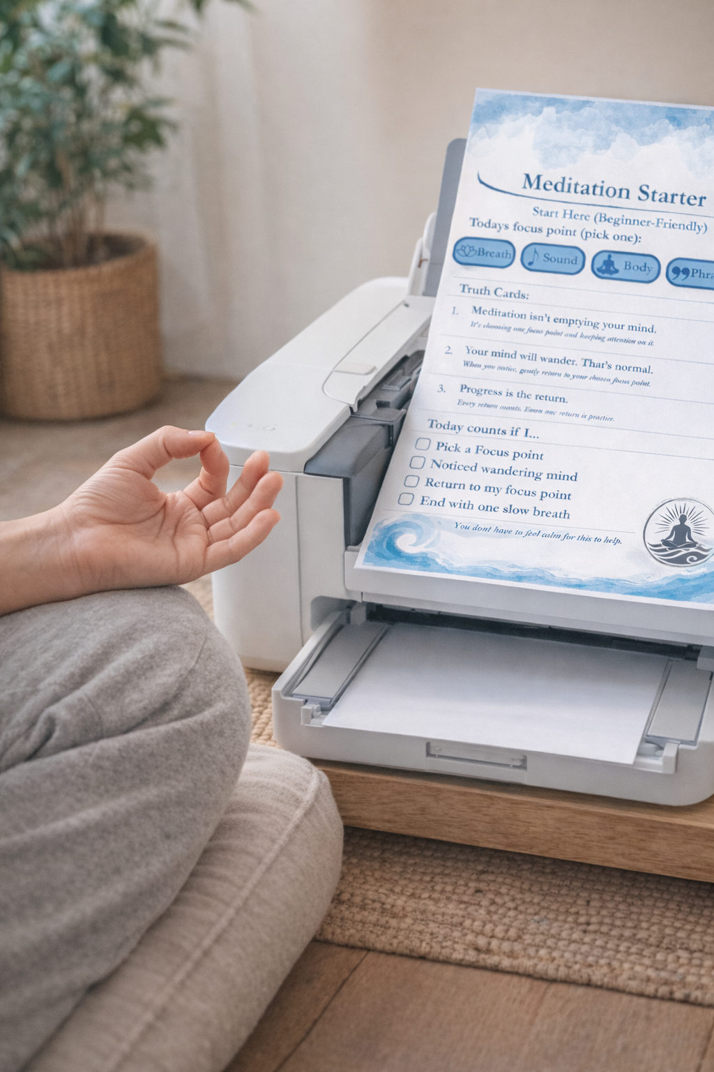 The Meditation Starter (Beginner-Friendly) is a one-page printable designed to make meditation feel simple and doable, especially if you’ve struggled with it before. It guides you to pick a single focus point (like breath, sound, body, a phrase, or a visual point), reminds you of the three core “truths” that make meditation work (you don’t have to empty your mind, wandering is normal, and progress is the return), and gives you a quick checklist so you can count the practice as a win even if you only noticed and returned once.
